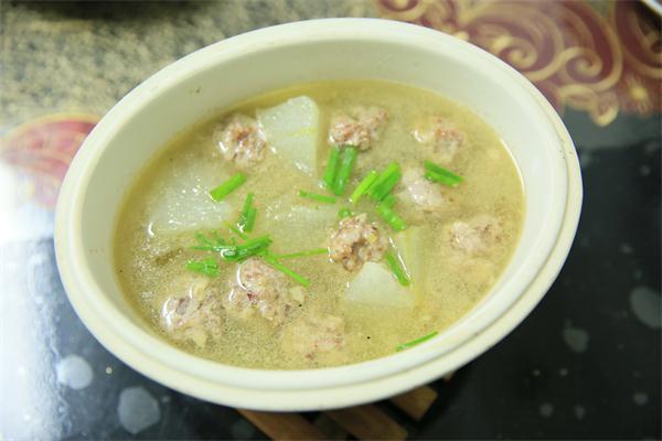 制作方法:夾心肉洗凈、剁碎,火腿切丁,生姜切末,備用;將上述材料混合,加入適量鹽、糖和料酒,再加入一個蛋清,用手混合均勻,再反復摔打至少10分鐘,至肉有彈性,再捏成大小適宜的小球,備用;豬大骨熬湯,備用;冬瓜洗干凈、切片,起油鍋略炒,加入大骨湯,燒開后逐一放入肉丸,再根據(jù)個人口味加入鹽等調味料,待肉丸燒熟即可起鍋。