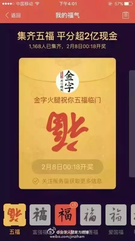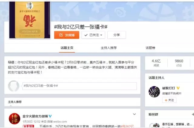 自前幾天支付寶將“集5福,搶2億+紅包”的活動規(guī)則公布后,一時間,有關(guān)福卡換贈的話題強(qiáng)行霸屏。在有金字粉絲集齊了五福后,金字順勢在微博平臺上策劃的#我與2億只差一張福卡#的微話題就引發(fā)了高達(dá)4.6億的閱讀量,網(wǎng)友們通過點(diǎn)贊評論及轉(zhuǎn)發(fā)分享的方式,第一時間表達(dá)了自己對于五福??ê痛和?億紅包的高度期待!