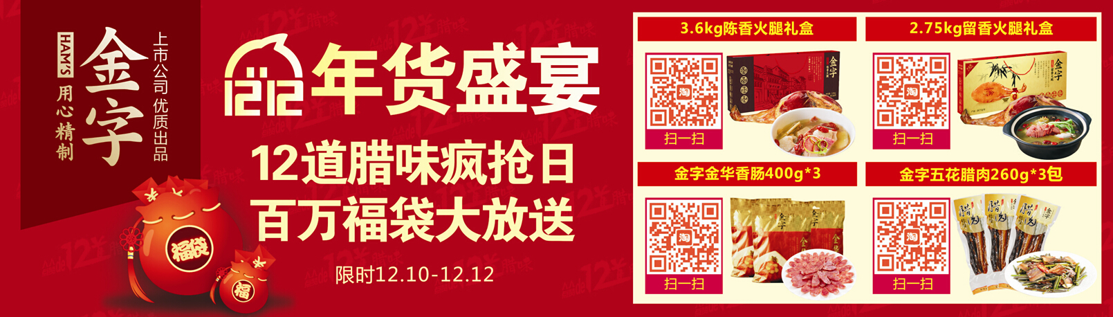 2015呼之欲來,在2014的年末,金字火腿以“12道臘味”致敬你過去1年的辛勞。12月12日,在金字火腿天貓旗艦店,最經(jīng)典的12款寶貝價(jià)格最低2折起,滿318元就送百元福袋(內(nèi)含2包45g肉棗、2包40g火腿片、1張肉票、1份利是封),還可參加抽大獎(jiǎng)活動(dòng),屆時(shí)將會(huì)抽取2名價(jià)值不菲的巴瑪火腿大獎(jiǎng)和24名價(jià)值500元的12道臘味大獎(jiǎng)。