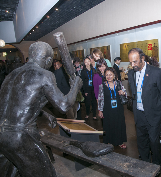 “Jinhua ham is so magical”,”This is delicious”“Good,Good”······5月9日上午,在 由金字興建的國內(nèi)唯一的中國火腿博覽館及世界火腿博覽館場館內(nèi)異常熱鬧,一聲聲包含著好奇、驚嘆、稱贊的英文不絕于耳。原來,是來自英國、湯加、毛里求斯等20國駐華使節(jié)50余人訪問團(tuán)在參觀考察。
